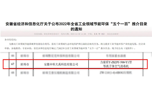 入選2023年全省工業(yè)領(lǐng)域節(jié)能環(huán)保“五個(gè)一百”推介目錄(節(jié)能環(huán)保新產(chǎn)品新裝備:G-ZKDY-2500-Y1型等離子體空氣消毒機(jī))