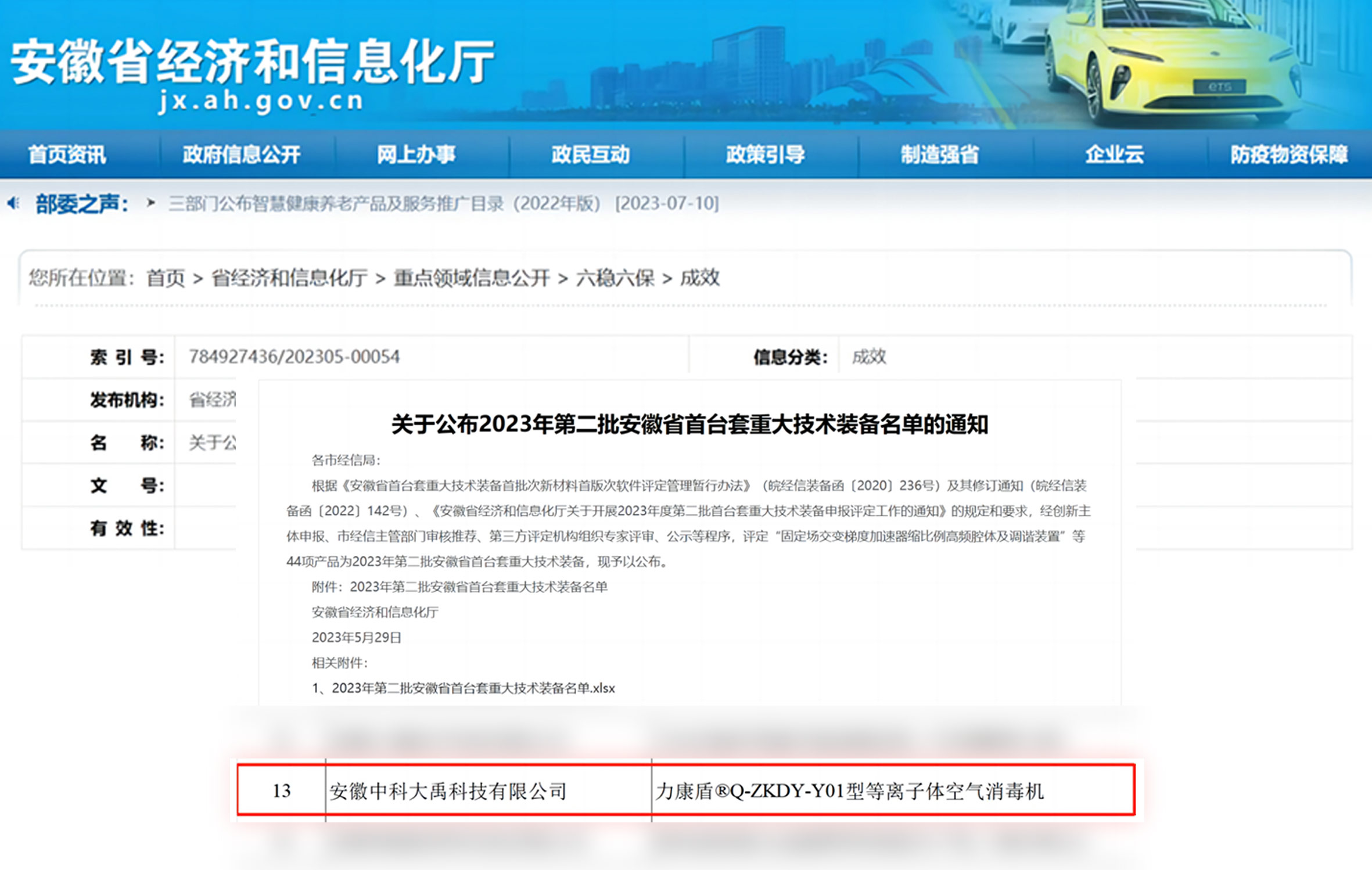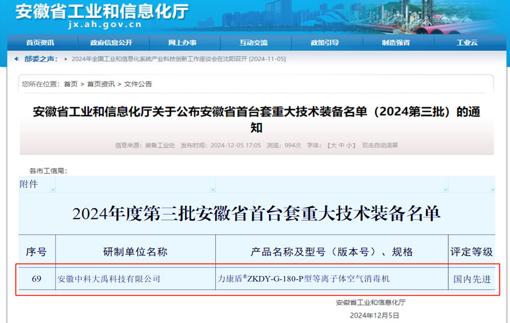 力康盾?ZKDY-G-180-P型等離子體空氣消毒機(jī)入選2024年度第三批安徽省首臺(tái)套重大技術(shù)裝備,評(píng)定等級(jí):國(guó)內(nèi)先進(jìn)